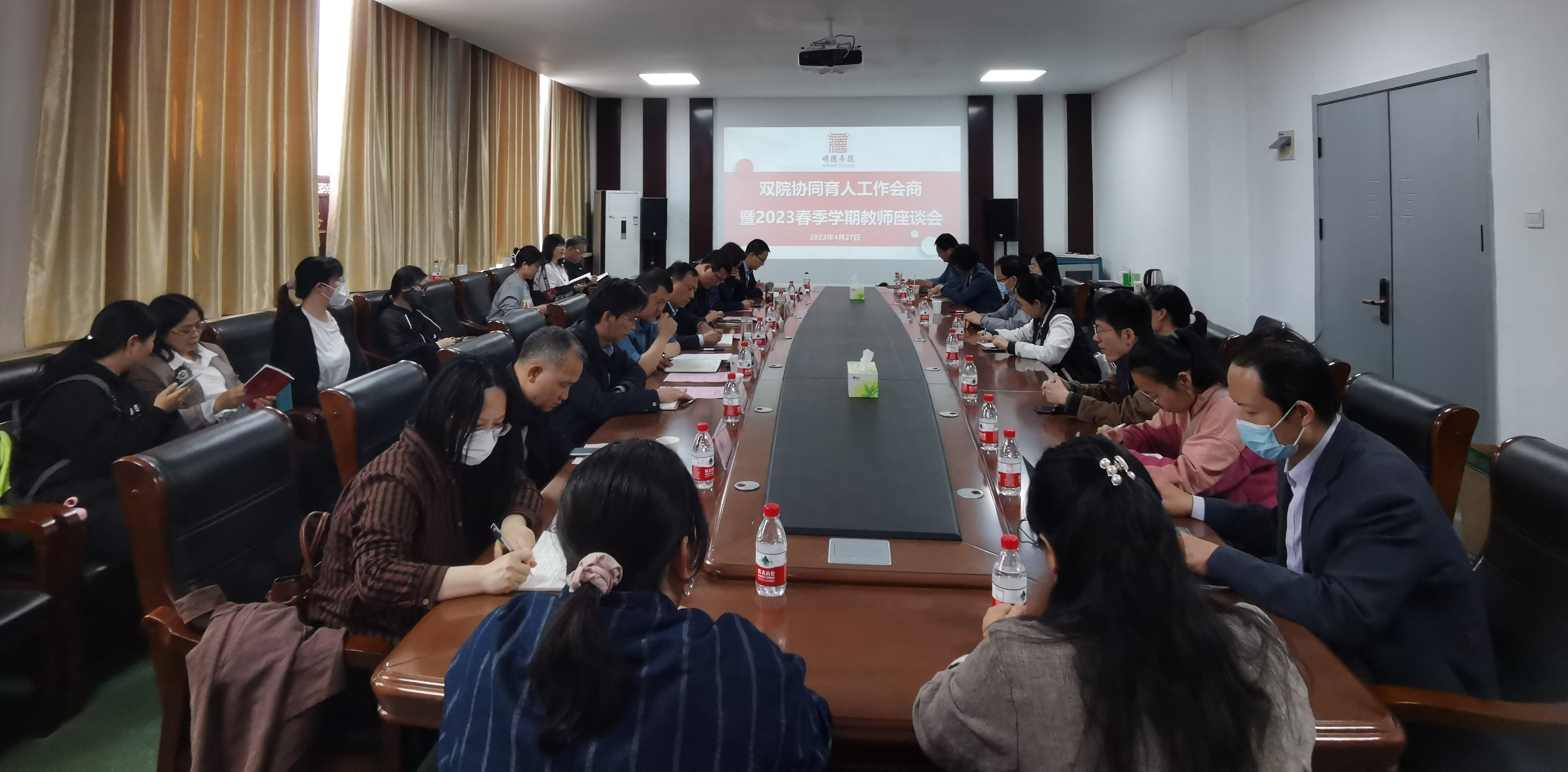 4月27日,书院召开了双院协同育人工作会商暨教师座谈会。会议第一阶段,各教师代表普遍反映我院学生到课早、出勤率高、学习积极性强,领悟能力强;认为嵩山路校区改造后,校园环境,教室环境和多媒体设备等有了大幅度的改善。同时,针对课堂教学设计、师生互动、过程性考核等方面充分交流,畅所欲言,分享了各自的教学体会与教学经验;针对教学环境优化、教师休息室改善、教师教学能力培养、学生学风建设等问题提出了建议和改进措施。会议第二阶段,各相关学院代表对双院协同育人工作中存在的问题进行交流,并就双院协同育人制度和体系进行了会商。