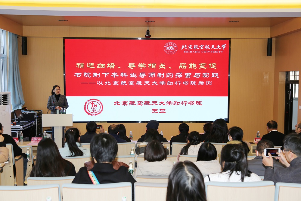 会议分为两个阶段,在第一阶段学业导师培训中,北京航空航天大学知行书院执行院长王亚,做了题为“精选细培、导学相长、品能互促,书院制下本科生导师制的探索与实践”的主题交流。她主要从知行p站视频简介