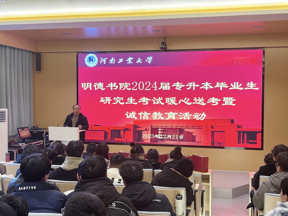 在实验楼118报告厅开展向考研学子送温暖暨诚信考试教育活动,书院党委书记魏朝举、院长谷存昌、党委副书记刘飞翔、副院长张雪萍和2024届110多名考研学子参加了此次活动,活动由毕业班辅导员王欢老师主持。