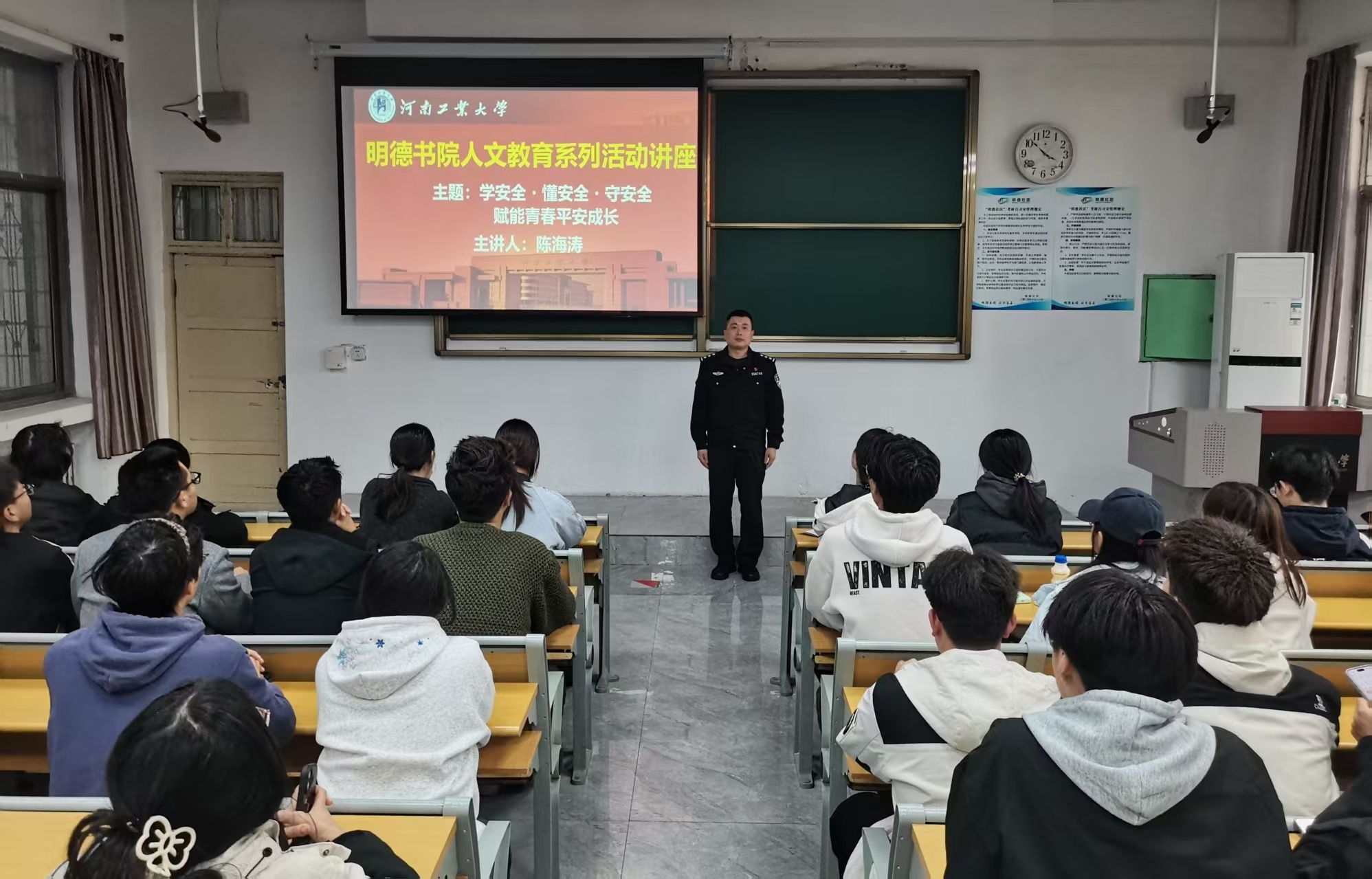 在嵩山路校区1120教室为2025级学生举办了主题为“学安全・懂安全・守安全 赋能青春平安成长”的专题讲座。本次讲座特邀郑州市公安局反诈支队宣传骨干,多年从事打击治理电信网络诈骗犯罪工作的民警陈海涛担任主讲嘉宾。讲座由p站视频