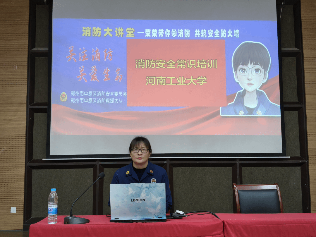 (东校区管委会)在小礼堂召开以“全民消防,生命至上”为题的消防安全教育讲座,进行消防安全常识培训。此次讲座特邀中原区消防救援大队的王春荣警官莅临主讲。