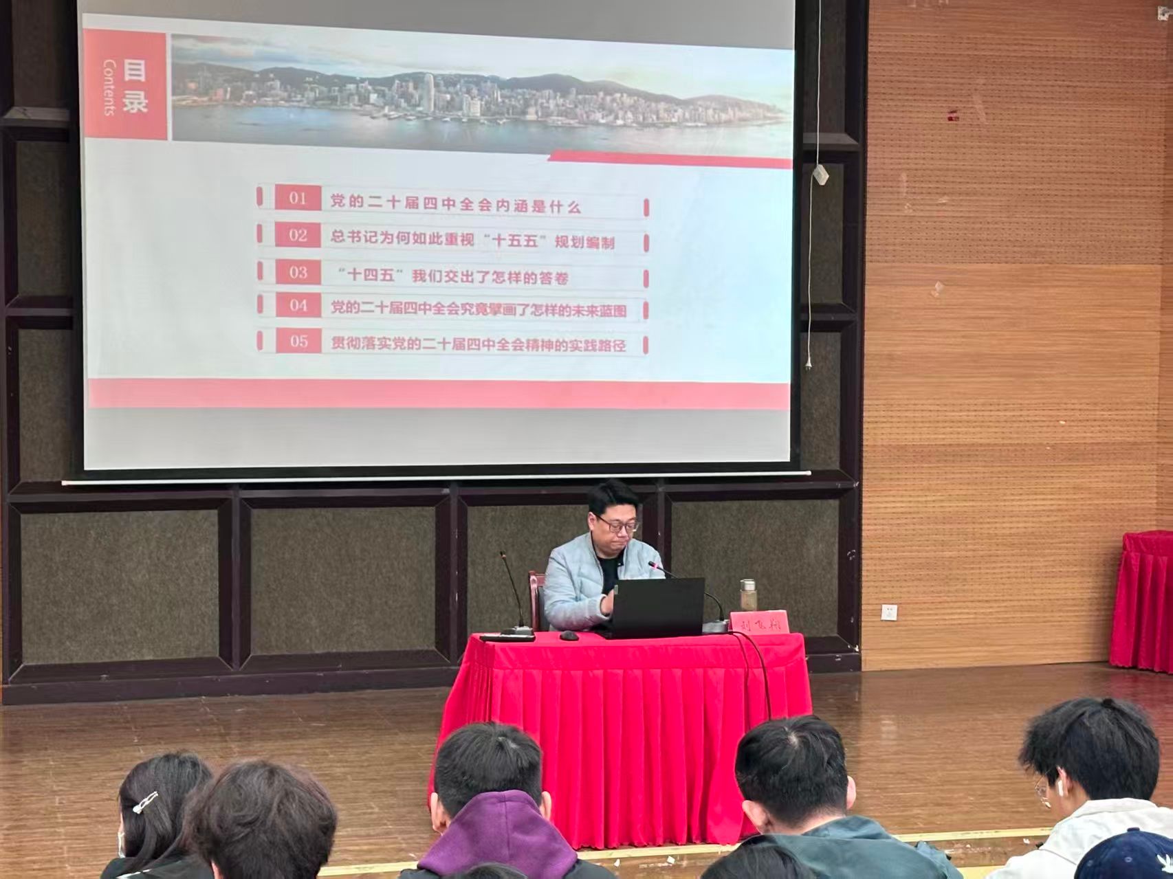 党委副书记刘飞翔在嵩山路校区小礼堂为第七期入党积极分子培训班全体学员作党的二十届四中全会精神专题宣讲。