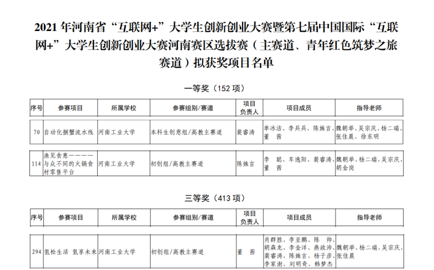 近日,2021年河南省“互联网+”大学生创新创业大赛暨第七届中国国际“互联网+”大学生创新创业大赛河南赛区选拔赛在河南师范大学成功举办。经过前期近四个月的项目征集、遴选和重点培育,我院三个学生团队项目入围省赛评选,最终荣获两项一等奖、一项三等奖的成绩,其中《自动捆蟹流水线》项目和《渔见食惠—与众不同的火锅食材零售平台》项目分别斩获高教-创意组和高教-初创组一等奖,并入围河南省国赛集训队。《氢松生活 氢享未来》项目获得高教-初创组三等奖。学院获奖数量和质量均创新高。魏朝举、杨二瑞、吴宗庆、张佳晨、胡金岗、徐东明老师荣获优秀创新创业指导老师奖。