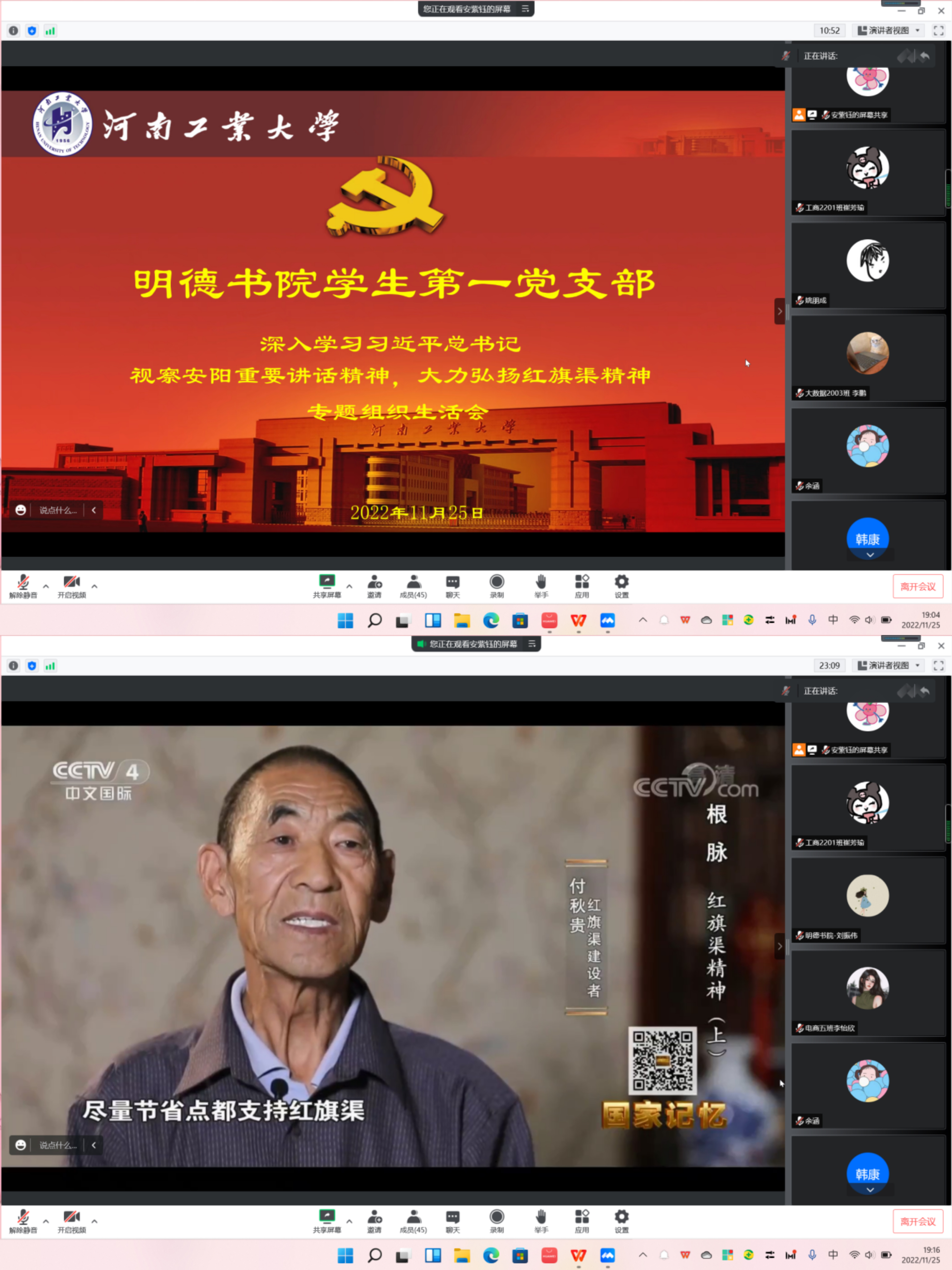 教工党支部、学生第一党支部、学生第二党支部及国防预备役党支部等四个党支部精心组织安排,带头深入学习习近平总书记视察安阳重要讲话精神,深入感悟红旗渠精神,并分别于11月25日、11月26日以“线上+线下”的模式组织召开专题组织生活会,p站视频